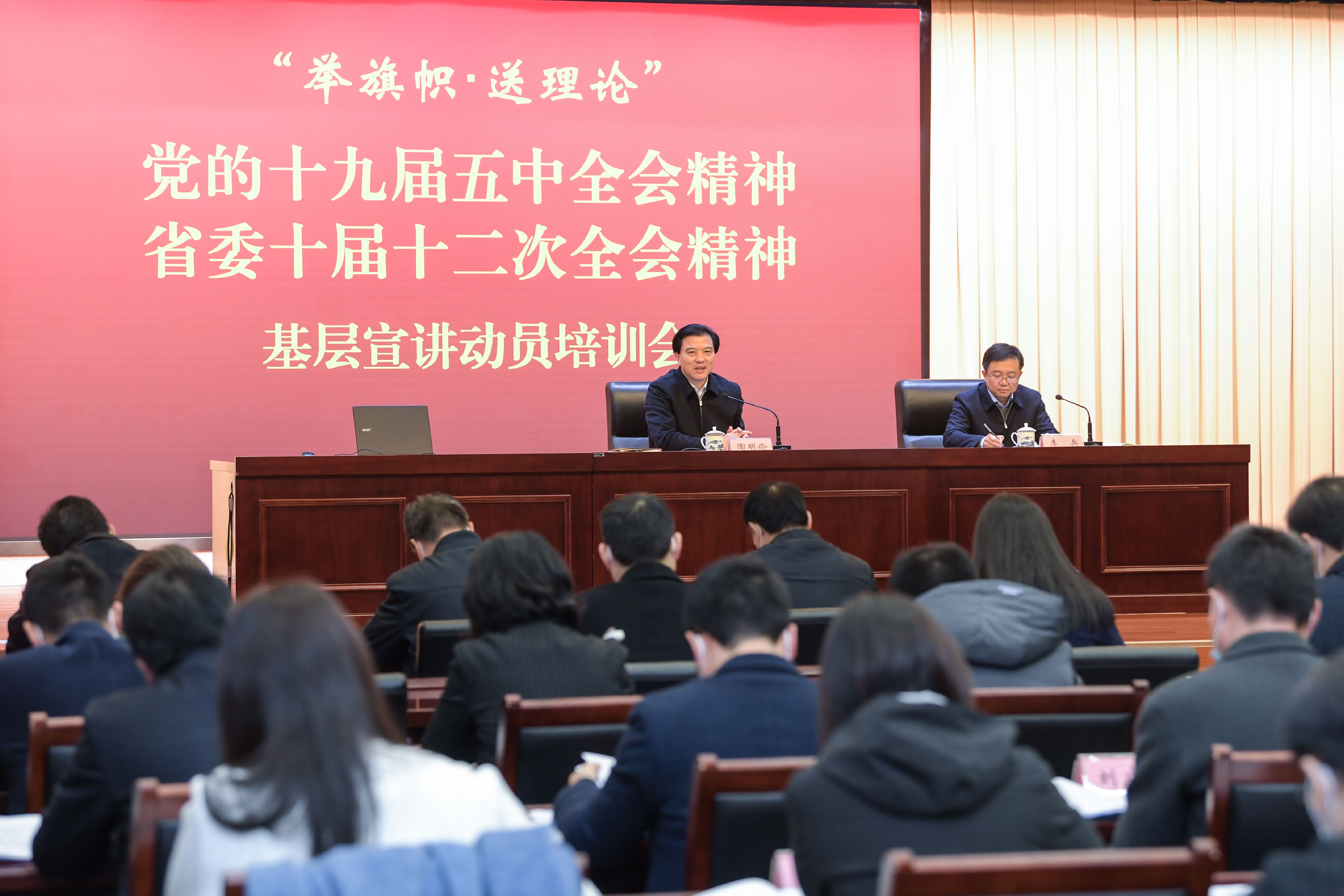 12月8日,“舉旗幟·送理論”學習貫徹黨的十九屆五中全會精神、省委十屆十二次全會精神基層宣講動員會召開。省委常委、省委宣傳部部長陶明倫出席會議并作講話。省委宣傳部副部長李兵主持會議。